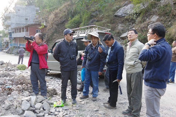 经各方反复磋商,设定了考察两个主要任务和考察路线:一是地质灾害考察,由地壳应力与地震专委会谢富仁研究员为队长,主要考察了尼泊尔地震地表变形带与活动断裂调查与尼泊尔地震触发滑坡与崩塌灾害调查。开展尼泊尔地震地质灾害科学考察具有两方面的科学意义,一方面可以研究总结低角度逆冲型地震的地质灾害特点,积累宝贵的第一手资料,研究成果可应用于我国大陆类似地区的地震地质灾害预测,如天山地区与青藏高原北缘;另一方面可与汶川地震地质灾害进行比较研究,深化对各类逆冲型地震地质灾害的科学认识,促进我国地震科学发展、提升防震减灾能力。