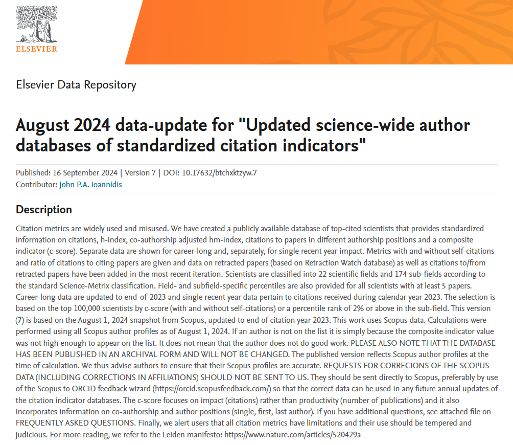 2024年9月16日,美国斯坦福大学发布了第七版全球前2%顶尖科学家榜单(World’s Top 2% Scientists 2023),榜单共分为“终身科学影响力排行榜”(career-long impact)——关注整个学术生涯迄今的影响力,及“2023年度科学影响力排行榜”(single-year impact)——聚焦本年度的学术成就。