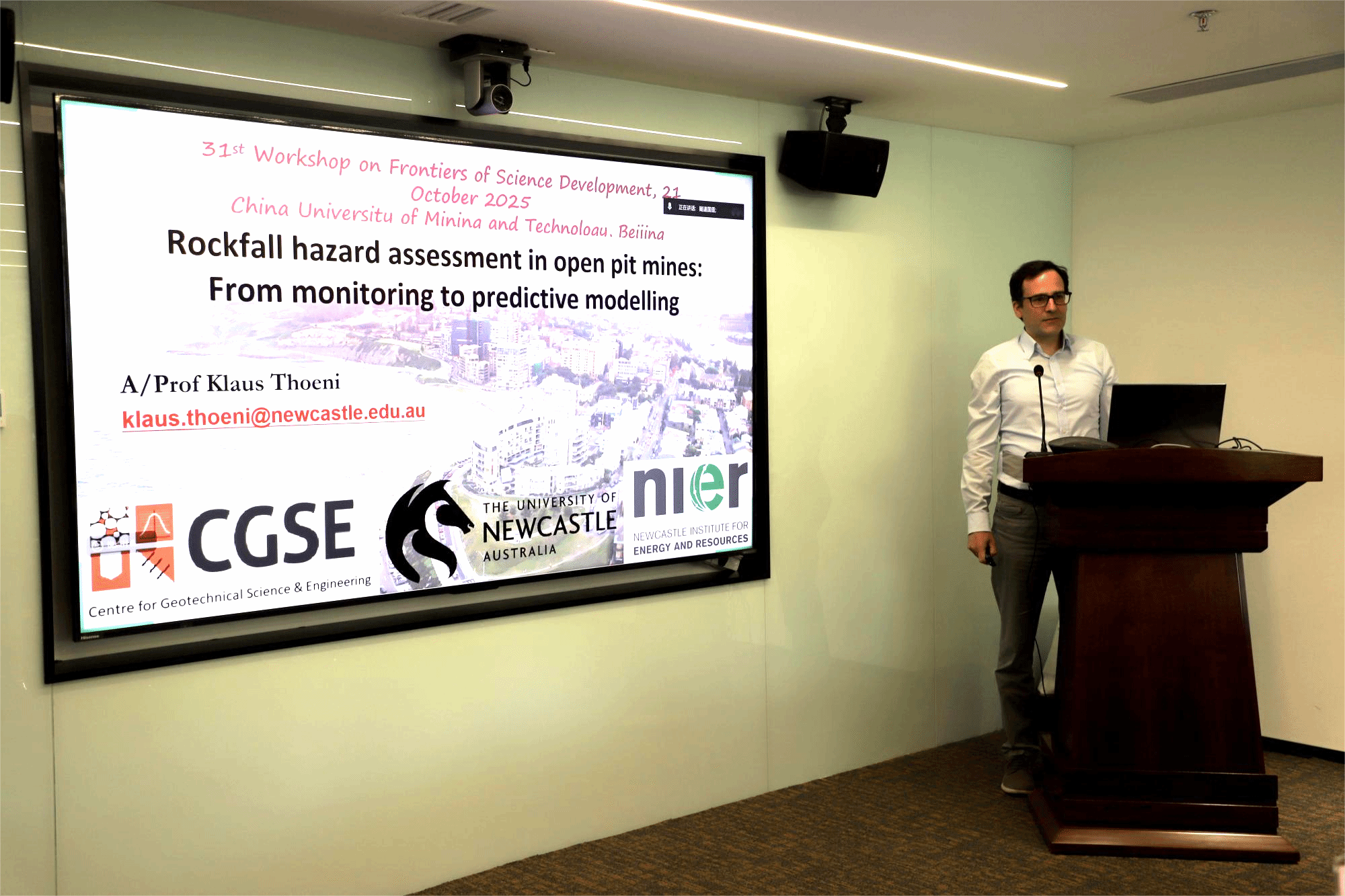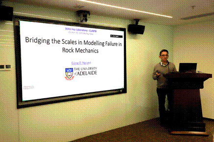 讲座上,Giang D. Nguyen副教授以“Bridging the Scales in Modelling Failure in Rock Mechanics”为题,系统阐述了岩石力学建模中破坏问题的尺度跨越见解,揭示了多尺度分析在揭示岩土材料变形破坏机理中的关键作用;Klaus Thoeni副教授做了题为“Rockfall hazard assessment in open pit mines: From monitoring to predictive modelling”的报告,重点介绍了人工智能方法在露天矿落石灾害预测与风险评估中的前沿应用;费文斌教授以“Multi-scale Studies in Energy GeoStorage”为主题,分享了能源地质储存中多尺度热-水-力-化(THMC)耦合过程的研究进展与工程启示。